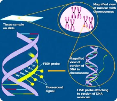 FISH stands for Fluorescence in situ Hybridization and refers to a technique where fluorescently-labeled DNA probes are designed to bind to intranuclear chromosomes (the genetic material of cells). While they can be used for a variety of cancers, FISH probes have been developed to look for common genetic abberations in bladder cancer including aneuploidy of chromosomes 3, 7, 17 and homozygous loss of 9p21.